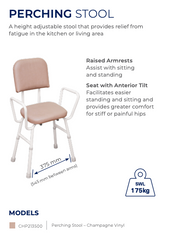 The Aspire Kitchen Stool with Arms is a height‑adjustable perching stool designed to reduce fatigue in kitchen or living spaces. Its anterior tilt seat and raised armrests make sitting and standing easier—especially helpful for users with limited hip mobility.