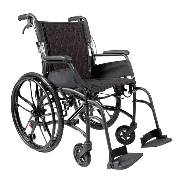 The Aspire VIDA X Folding Manual Wheelchair is a sleek, ultra-lightweight transport chair built for convenience, comfort, and style. Weighing just 12.2 kg and featuring 22″ sports mag wheels, it offers effortless mobility and easy folding for compact storage or travel.