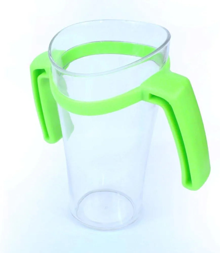 The cup’s ergonomic handles and spill‑resistant design make it a reliable and practical drinking aid for users with limited head movement or reduced swallowing ability.