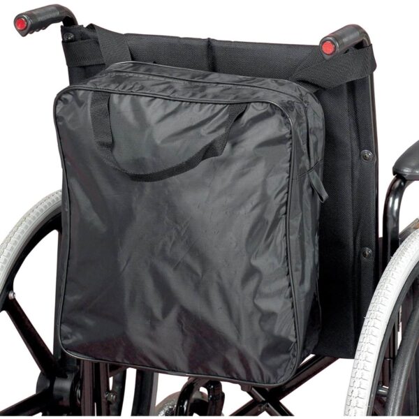 This high-quality bag fits securely over the back of most wheelchairs. It features sturdy loops that slip easily over the pushing handles and carry handles for off-chair portability. The zip-top closure provides quick and easy access to your belongings.