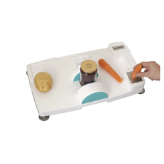 The Homecraft Kitchen Workstation combines several helpful features into one convenient device. The durable chopping board has suction cup feet to keep it in place during use. After securing it on your countertop, use the board for prepping food. The L-shaped corner keeps a slice of bread in place while you butter it or spread jam or jelly on it. A removable clamp holds a bowl for mixing ingredients. The clamp edge reverses from flat to contoured depending on your needs.