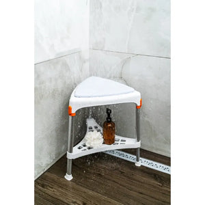 The King Triangle Stool with Tray (Adjustable Height) is a compact, space-efficient bath or shower stool designed to fit neatly into corners. Its triangular shape, height adjustment, and built-in tray make it a smart solution for smaller bathrooms, wet rooms, or tight shower spaces.