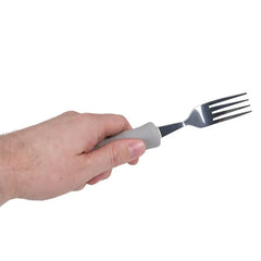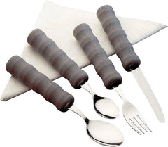 Intended to provide a comfortable meal experience for those who struggle with grip. Standard Cutlery including a knife, fork, spoon and teaspoon, is available individually or as a set, hand-washable only. Angled Cutlery features stainless steel utensils with angled heads to help individuals with limited wrist or arm movement. The fork and spoon are at 40° angles and available as left- or right-hand options. The knife is at a 90° angle and can be used without cocking the wrist. One-handed Cutlery features a stainless steel utensil with a lightweight foam handle that combines multiple cutlery functions.