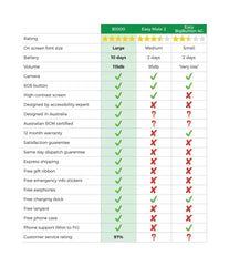 A simple-to-use mobile with big buttons, big text, loud volume, long battery, speed dial, and an SOS button. Made in Australia with accessibility in mind. Supports all 4G Australian networks—just pop in a nano‑SIM and go.