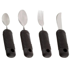 Sure Grip Bendable Utensils are sold individually or as a set of 4. The set of 4 eating utensils include the rocker knife (does not bend), bendable fork, bendable tablespoon, and bendable teaspoon. The spoons and fork feature a twist in the metal shaft that provides easy bending to any angle, assisting those with reduced range of motion. The knife has a curved rocker blade that requires only minimal arm strength for cutting.